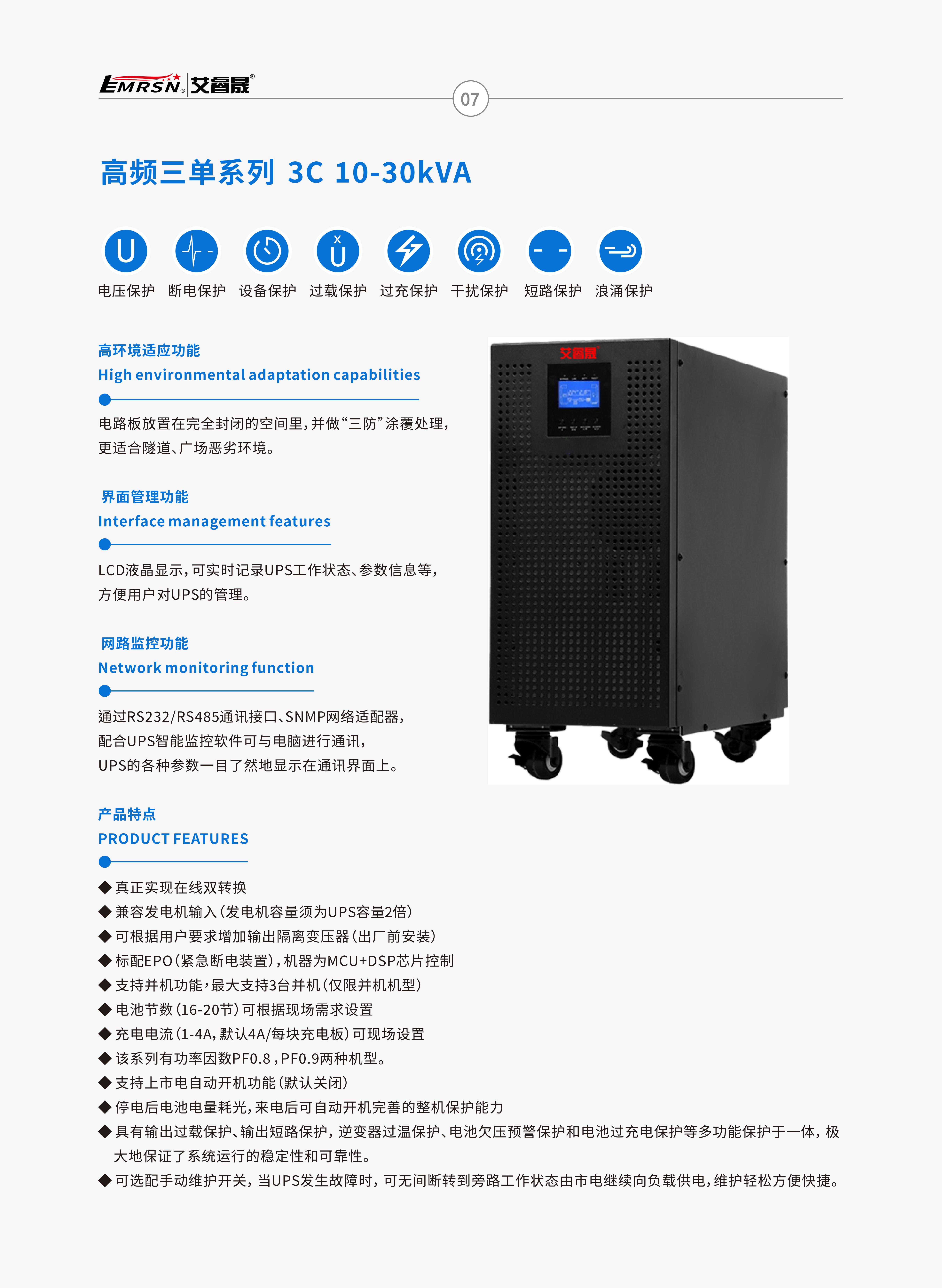 艾睿晟UPS电源三进单出高频机,功率范围10KVA~30KVA,更多机型或者详情参数可以咨询全国统一服务电话400-887-6565.