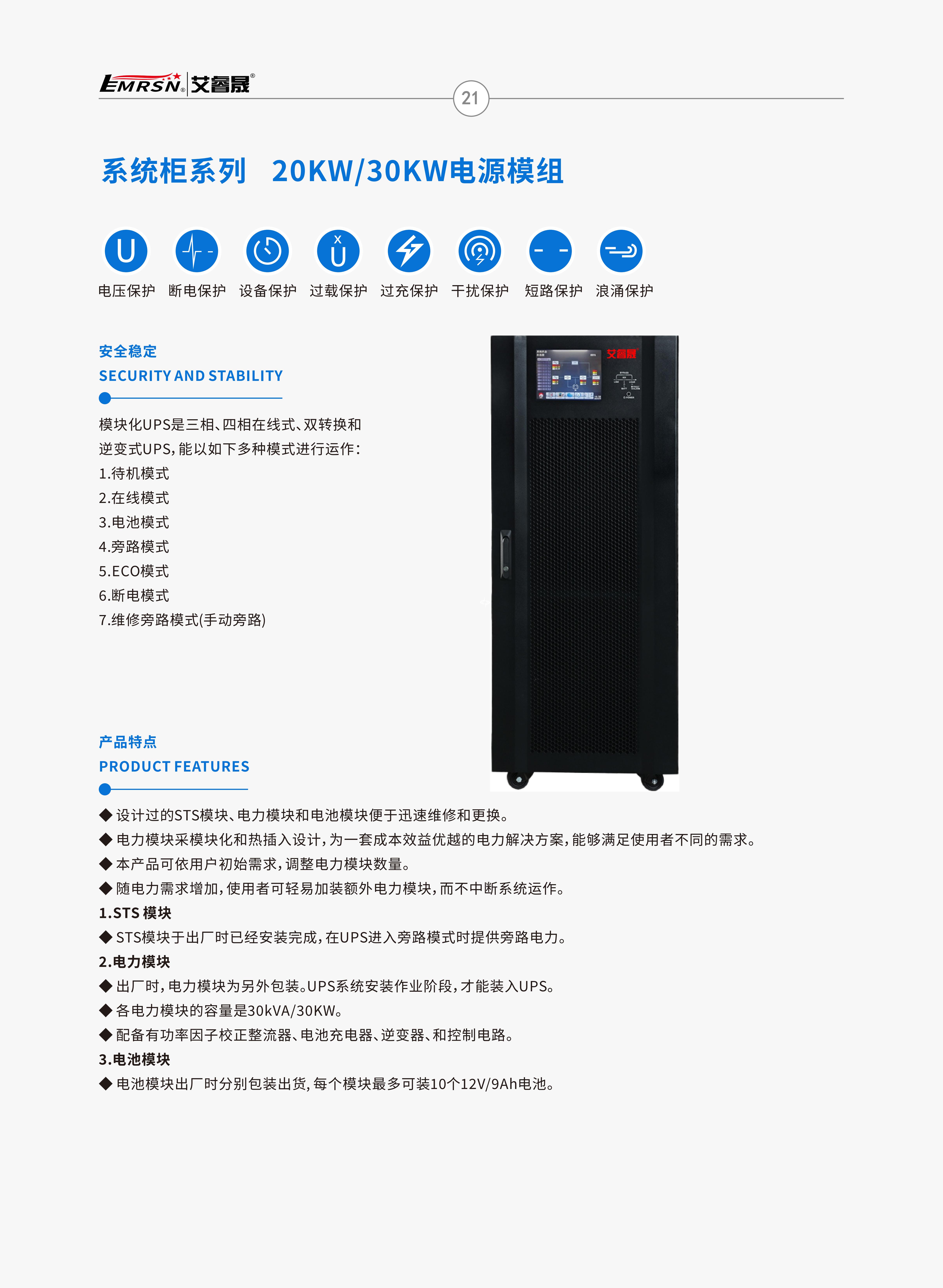 艾睿晟模块化UPS电源支持20KVA、30KVA、50KKVA、60KVA功率模块,系统柜功率范围60KVA~600KVA,功率因数1.0,详情参数可以咨询全国统一服务电话400-887-6565.