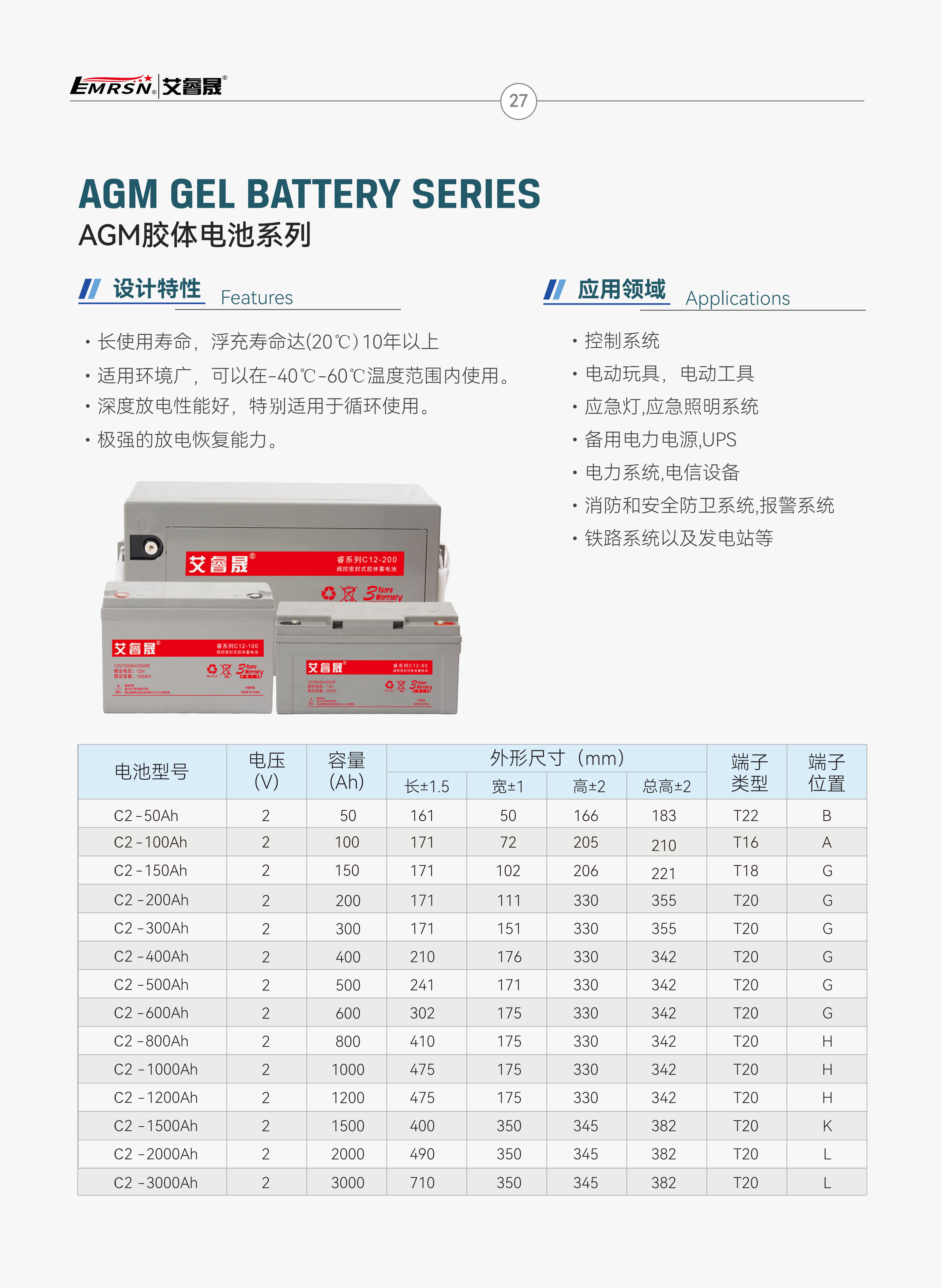 艾睿晟胶体蓄电池,免维护工作,长使用寿命,浮充寿命达(20C)10年以上,可以在-40C~60C温度范围内使用,极强的放电恢复能力。更多型号或者详情参数可以咨询全国统一服务电话···